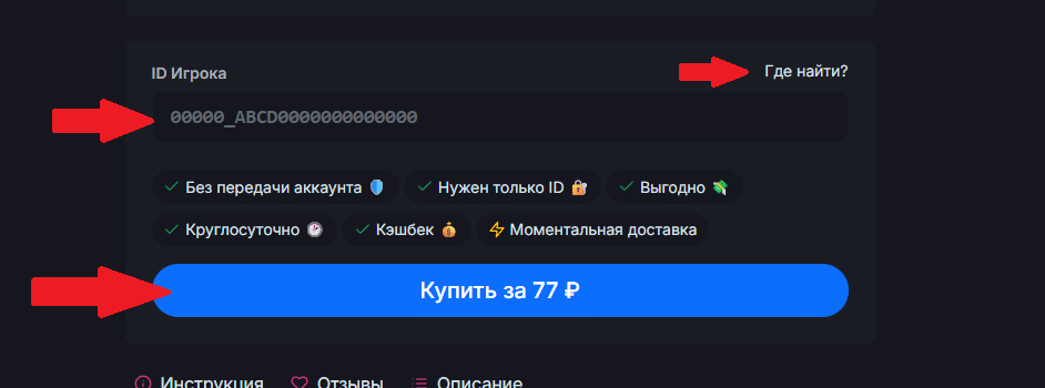 - Далее впишите свой ID игрока. Если не знаете, где его найти, можно посмотреть краткую инструкцию, нажав «Где найти?». Теперь переходите к кнопке «Купить».