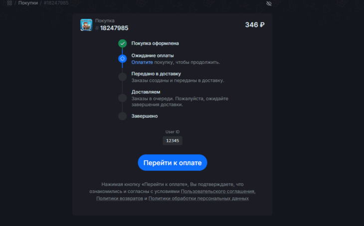 - Обязательно проверьте правильность введенного User ID, выберите удобный для вас метод оплаты и подтвердите создание покупки.