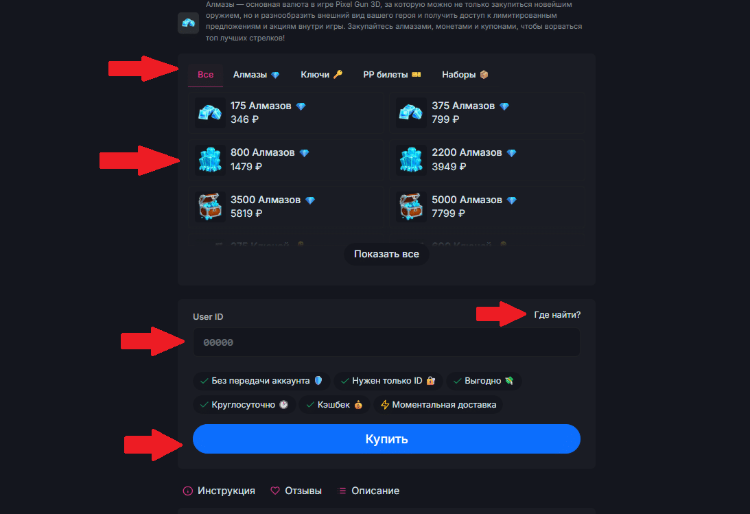 - Выберите нужную вам категорию, после чего — интересующий товар. В поле ниже введите свой User ID. Если вы не знайте, где его найти, то можете посмотреть инструкцию, нажав на «Где найти?». После ввода можете перейти к покупке.