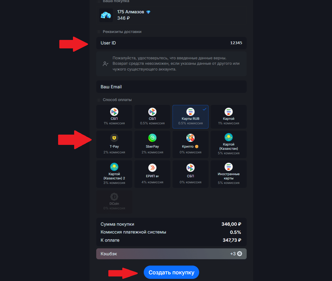 - Обязательно проверьте правильность введенного User ID, выберите удобный для вас метод оплаты и подтвердите создание покупки.