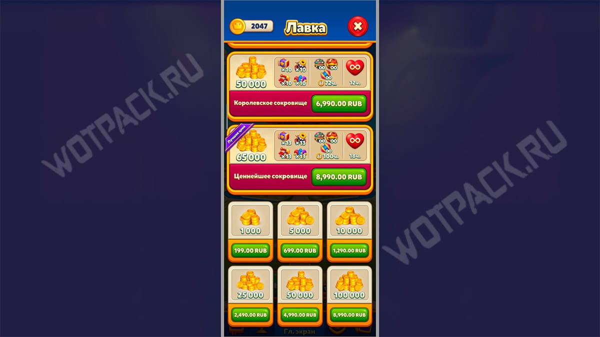 Зарабатывать валюту можно в награду за прохождение уровней, но её дают слишком мало для комфортной игры. Если решитесь купить наборы и монеты в Королевский матч, то сможете растянуть увлекательные сессии и перестанете переживать за каждый неудачный ход.