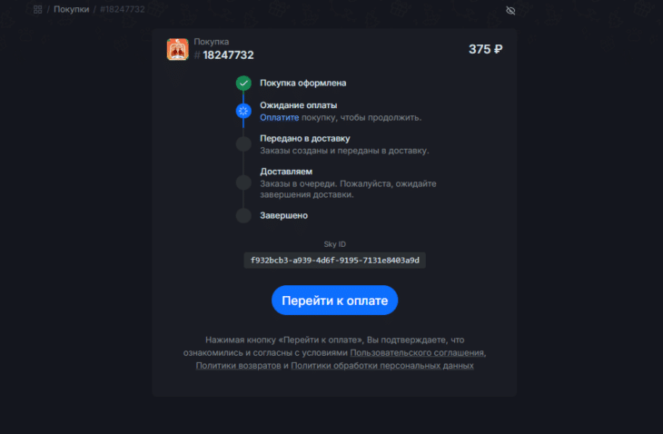 - На следующей странице проверьте, правильный ли Sky ID, выберите удобный способ оплаты, и нажмите на «Создать покупку».