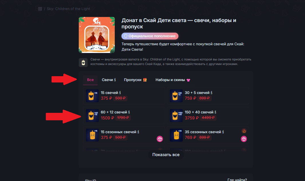 Используйте горящие свечи для общения с окружающими, кастомизации персонажа и разблокировки новых эмоций. А если запас предметов иссякнет или появится желание дополнить образ новым аксессуаром — обратитесь к сервисам для пополнения.