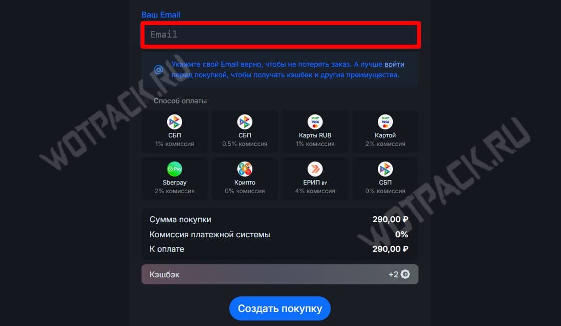 - Для создания личного кабинета и отслеживания статуса выполнения заказа укажите актуальный почтовый адрес. Остается выбрать удобный метод оплаты, среди доступных представлены СБП, рублевые и Visa/Mastercard карты, а также популярные криптовалюты. В завершение нажмите «Создать покупку», перейдите к оплате и завершите её.