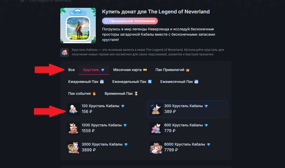 Официальное пополнение осуществляется через магазины Google Play и App Store, но по российским картам мобильные сервисы не проводят транзакции. Самым выгодным способом купить хрусталь в The Legend of Neverland в текущих условиях является платформа donatov.net.