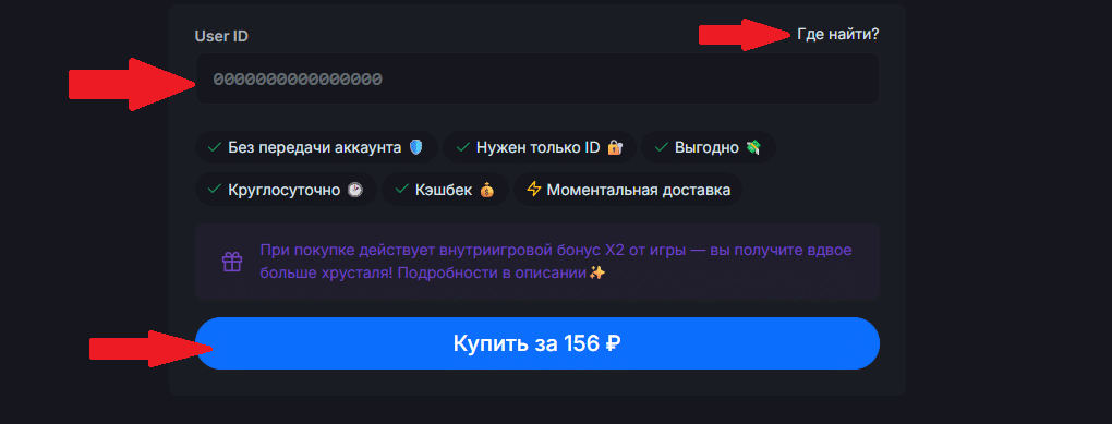 - В поле ниже введите свой User ID. Если не знаете, где его найти, можете посмотреть небольшую инструкцию, нажав кнопку «Где найти?». После ввода UID перейдите к кнопке «Купить».