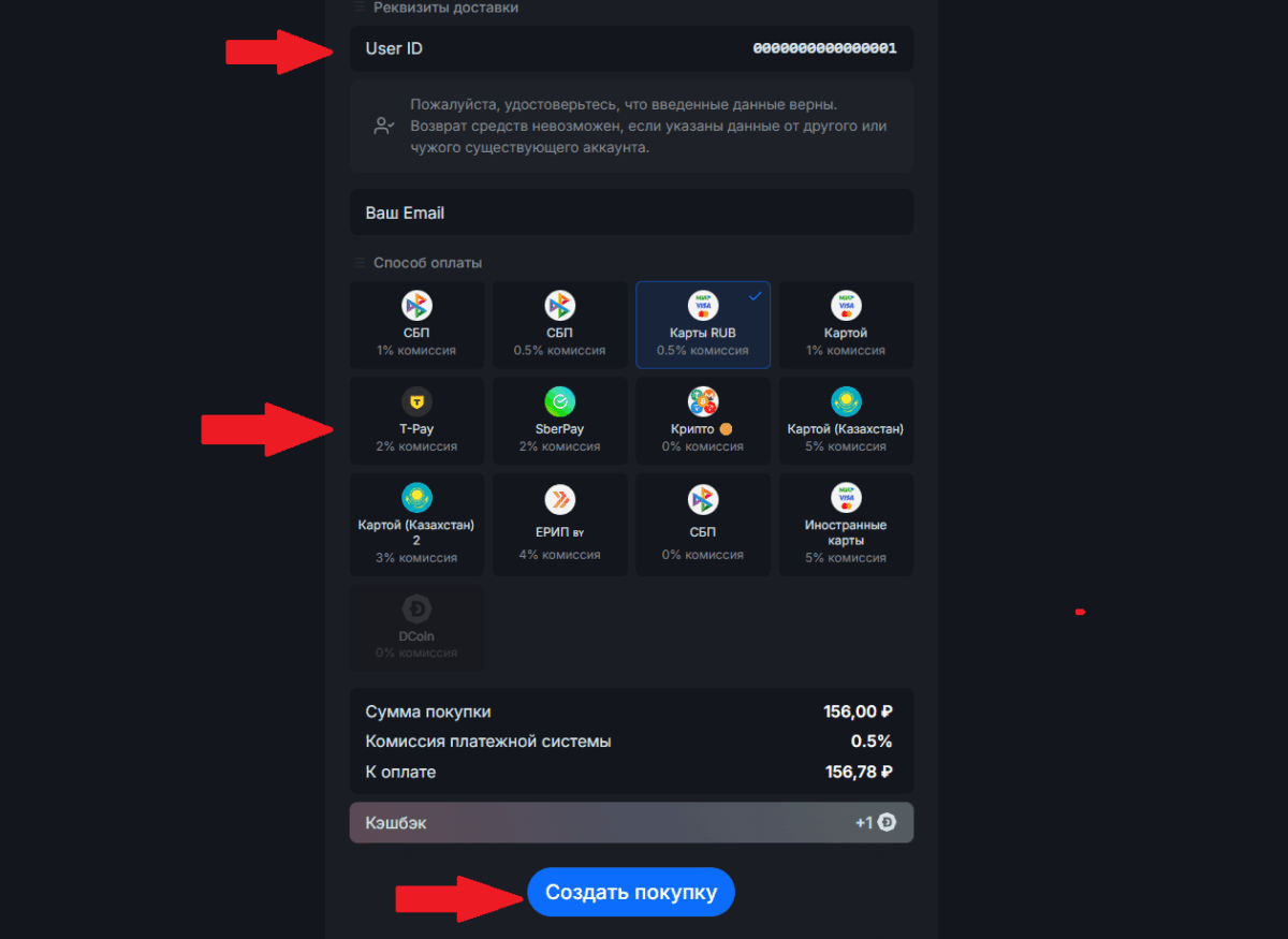 - На новой странице проверьте правильность введенных данных, выберите удобный метод оплаты из представленных и нажмите «Создать покупку».