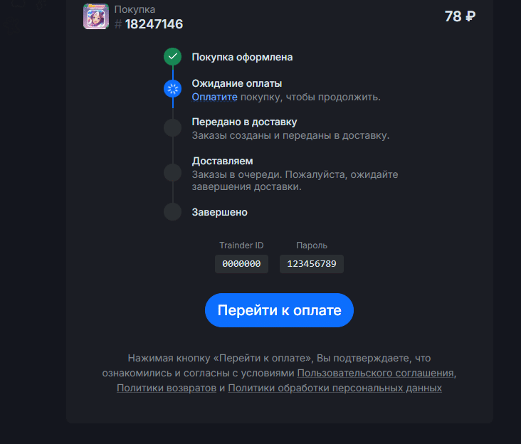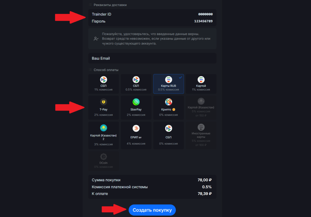 - В двух полях ниже укажите данные своего аккаунта: Trainder ID и пароль. Если не знаете, где взять идентификатор, можно кликнуть на «Где найти?» для получения инструкции. Рекомендуется сменить пароль до оформления заказа и после его получения. Введите реквизиты, поставьте галочку и нажмите «Купить».