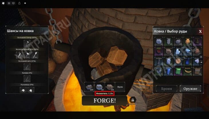 - Вернитесь в город и переплавьте руду в тяжелую броню или оружие: дешевые и дорогие материалы отправляйте раздельно.