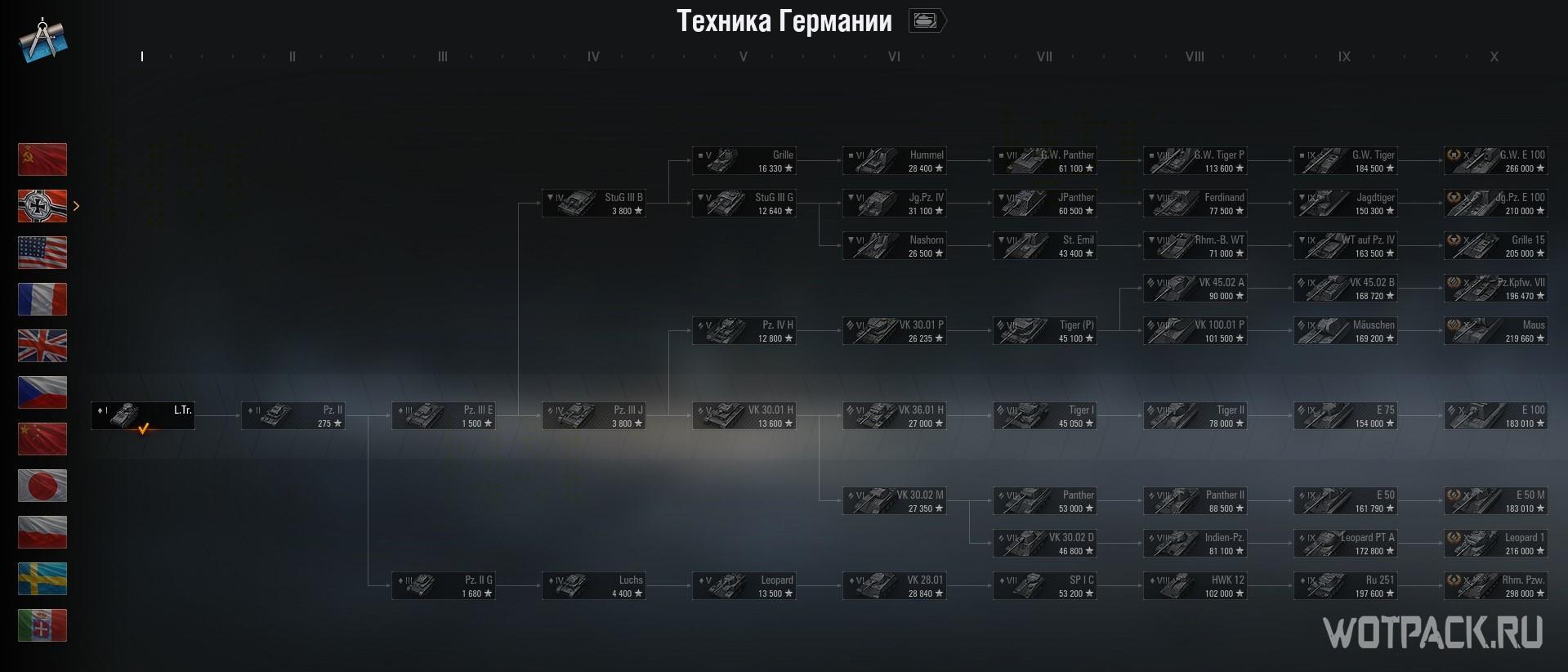 Немецкую ветку перелопатили сильнее всего — 22 танка. Это вполне логично, ведь она была очень запутанной и многочисленной на низких уровнях. Обратите внимание на ПТ-САУ 8 уровня Jagdpanther II. Именно ее выбирало большинство игроков, она подкупает превосходной подвижностью и высокой огневой мощью. Теперь же альтернатив не будет, останется только Ferdinand.