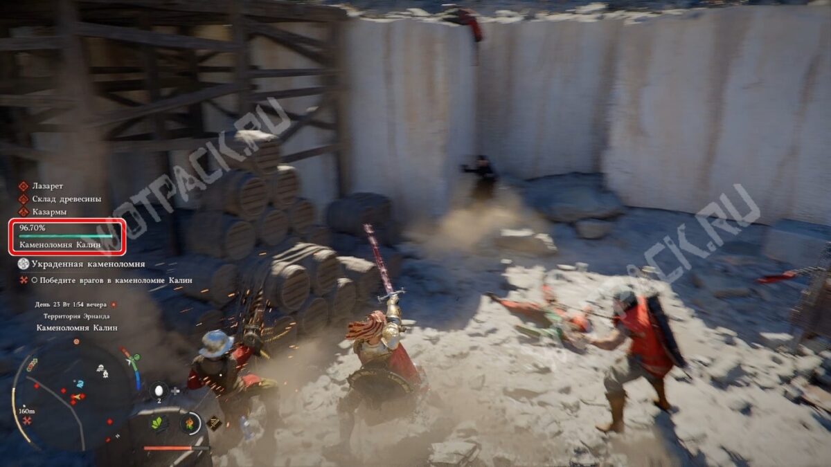В левой части экрана над мини-картой есть зелёная шкала, заполненная на 100%. Каждый убитый рядовой враг в захваченной области снижает полоску на 0,55%. Чтобы карьер считался освобождённым, нужно довести полоску до нуля — убить около 182 бандитов. Запаситесь терпением и начинайте методично вычищать территорию.
