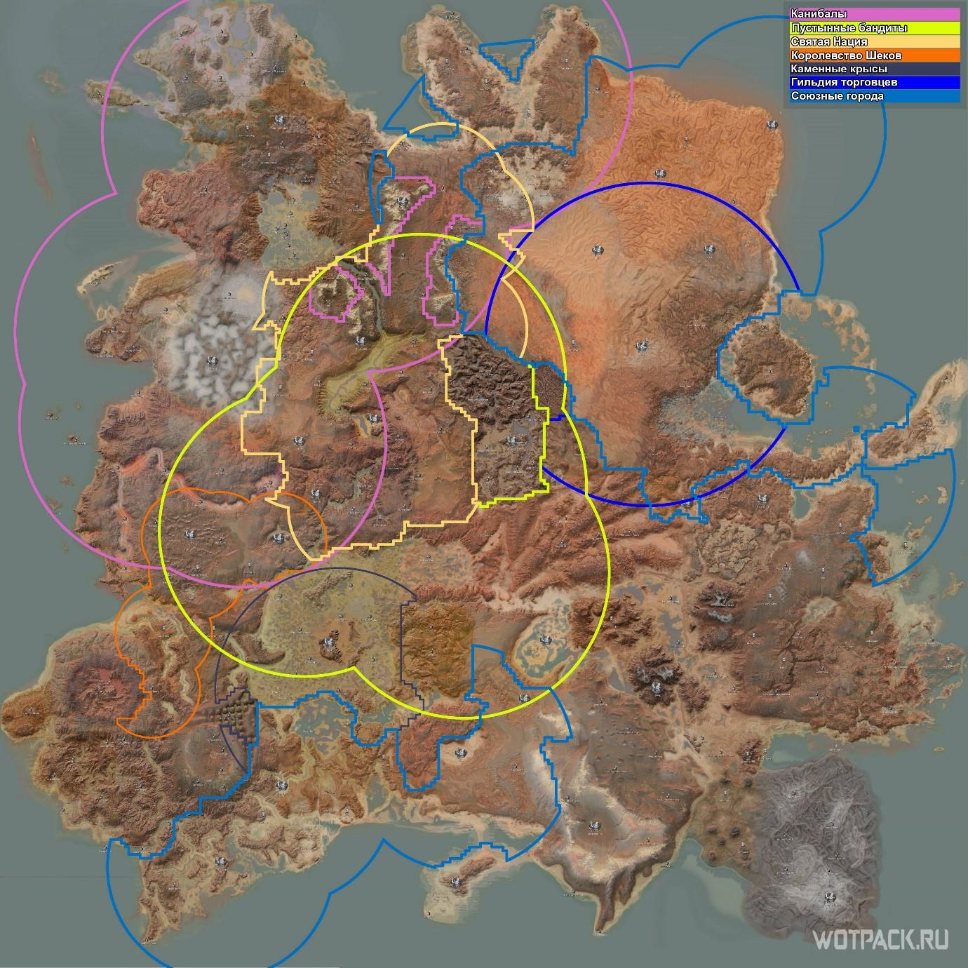 На изображении территории фракций выделены определенным цветом:- Каннибалы — розовый;