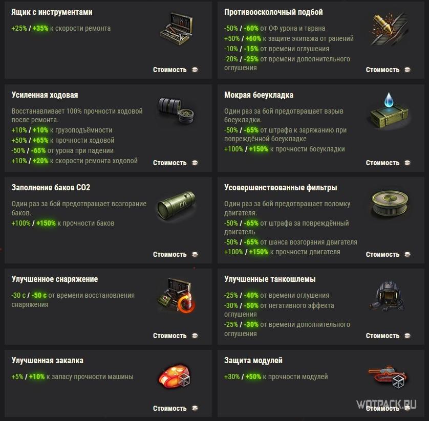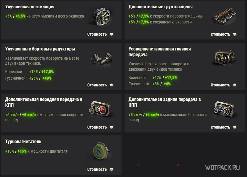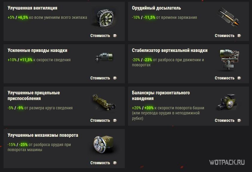 Каждому виду оборудования присвоена определенная категория, которая зависит от его назначения. Например, к огневой мощи относится орудийный досылатель, к живучести противоосколочный подбой, на мобильность влияет турбонагнетатель, а улучшит разведку соответственно оптика.