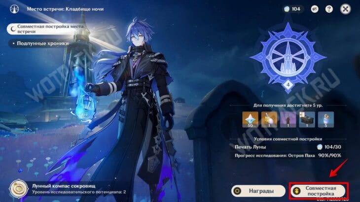 Для получения наград репутации и улучшения компаса необходимо прокачивать постройку. Это можно сделать при взаимодействии со стеной здания, где изображен герб светоносцев. В открывшемся меню выберите кнопку «Совместная постройка», для активации которой необходимо достаточное количество печатей Луны и определенный прогресс изучения острова Паха. Прокачка потребует следующие условия: