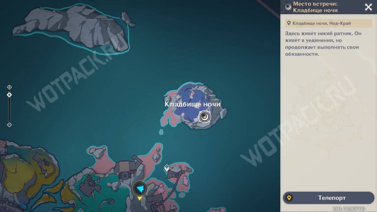 Кладбище ночи расположено в северной части пограничья в Genshin Impact на востоке от острова Фатуи. Эта небольшая локация с маяком и мрачной атмосферой наполнена могилами и призраками светоносцев прошлого, с которыми можно взаимодействовать ради историй или для получения различных наград.