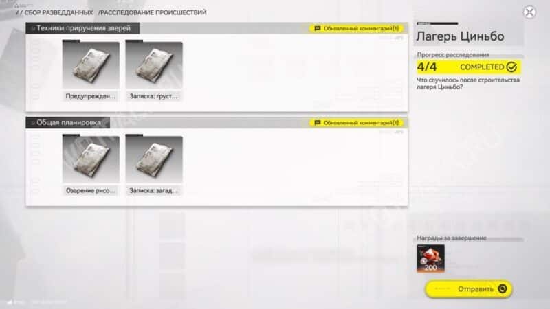 일시 정지 메뉴를 열고 오른쪽 패널에서 모든 단서가 저장된 "보관"을 찾으세요. "정보 수집" 탭에서 다음을 찾을 수 있습니다. 아홉 작성해야 할 보고서가 담긴 폴더들.