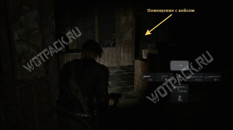 В отдалённом углу помещения есть вход в раздевалку полицейского участка — здесь и находится кейс.