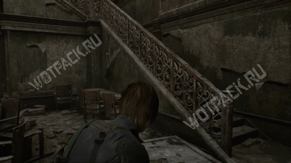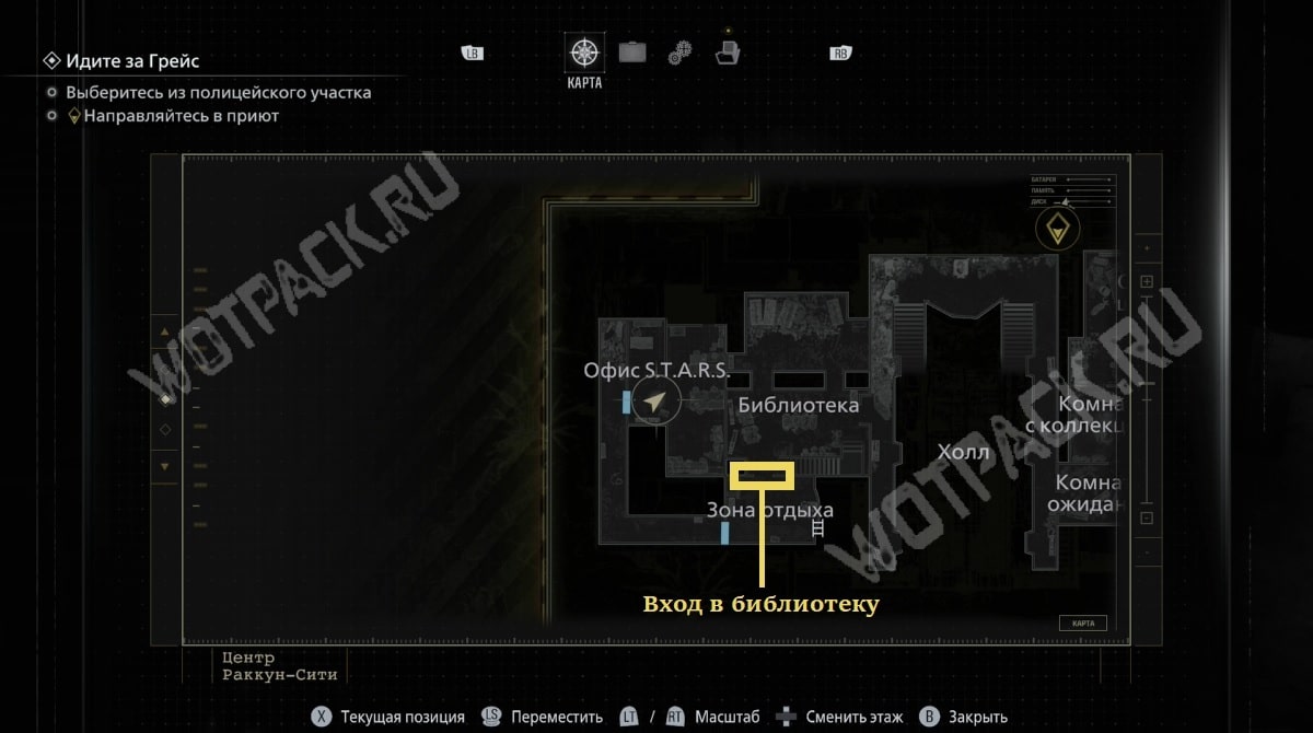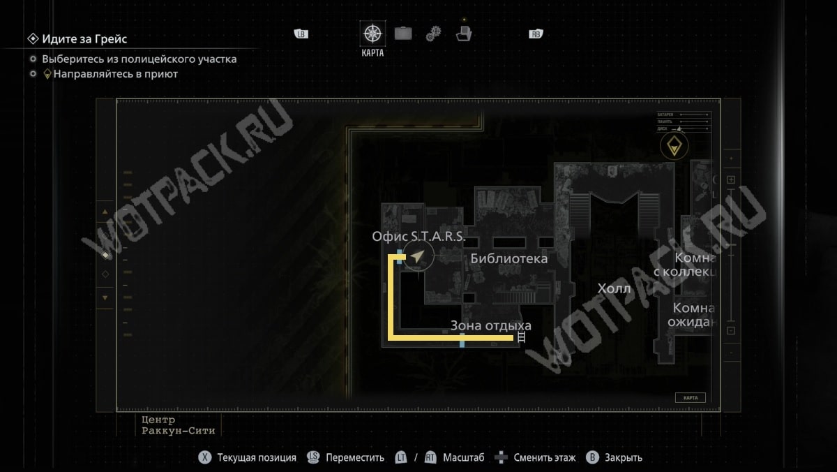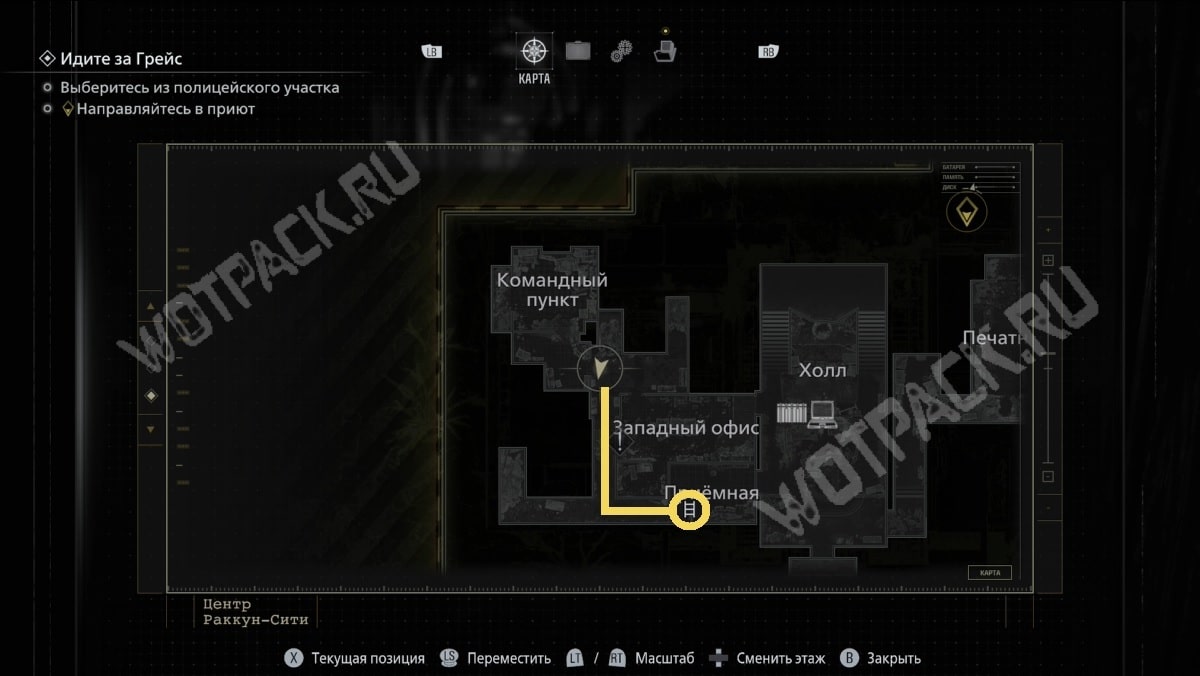 От командного пункта пройдите в сторону приёмной, ориентируйтесь по метке лестницы на карте. Поднявшись на второй уровень, двигайтесь по коридору от зоны отдыха — так выйдете к рабочему крылу.
