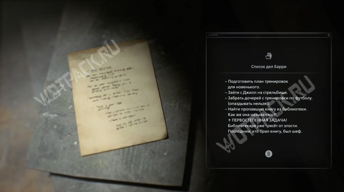 Напротив раздевалки, на столе прочитайте записку «Список дел Барри». Автор записки пишет, что главное — найти пропавшую книгу. Для этого отправляйтесь в библиотеку.