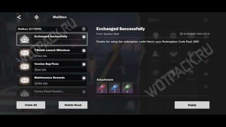 После успешно выполненной операции в верхней части экрана всплывёт уведомление, что вознаграждение было отправлено на внутриигровую почту (Mailbox).