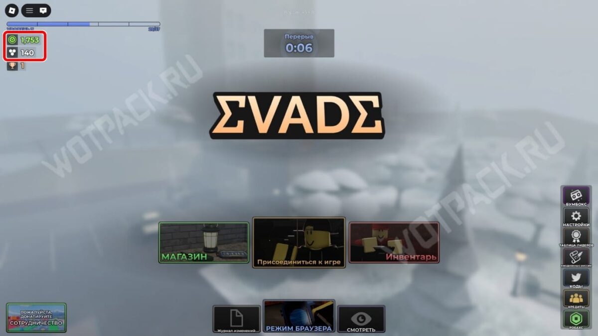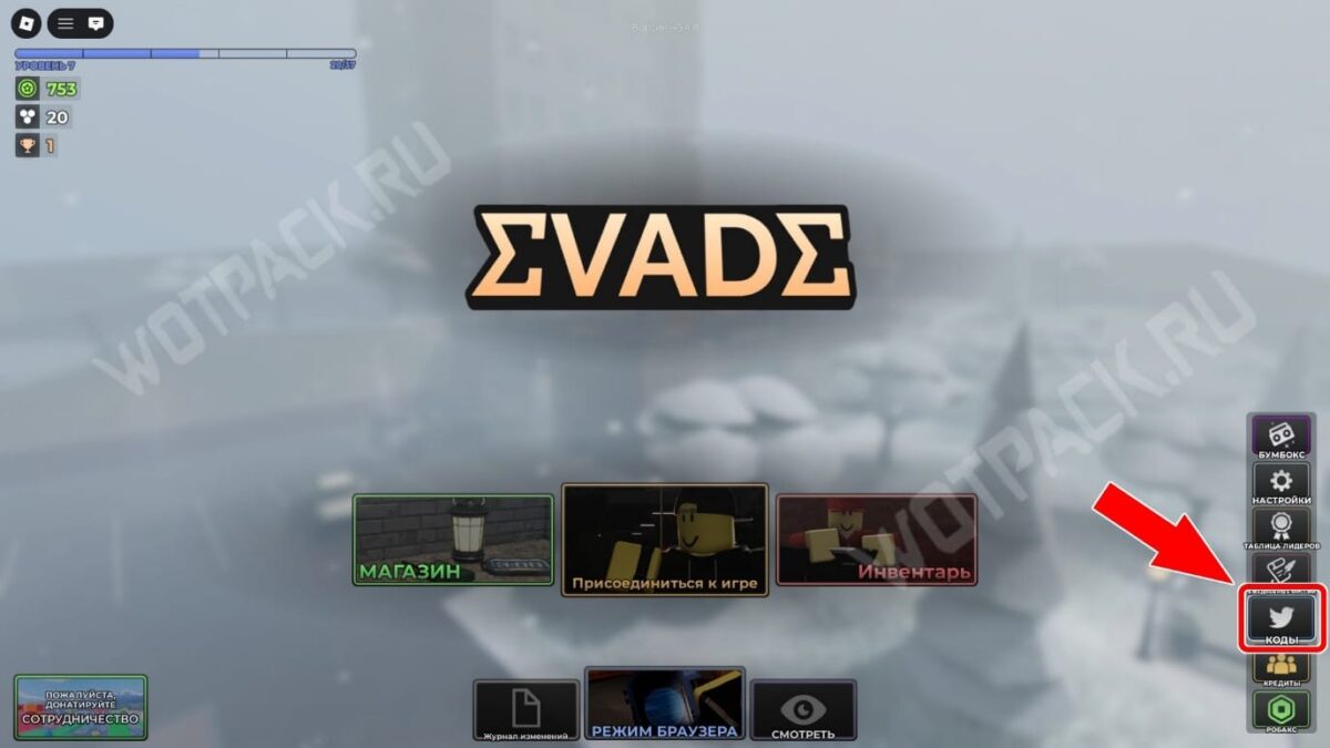 Куда вводить промокоды в Evade в Roblox