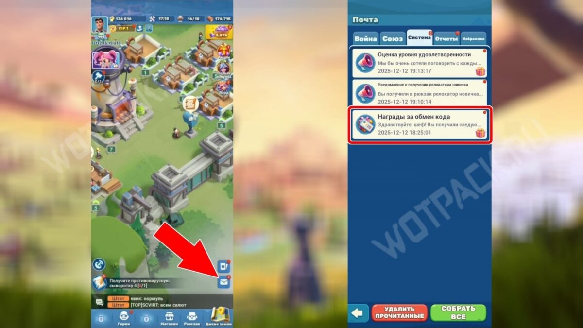 После успешного подтверждения обмена воспользуйтесь внутриигровой почтой. Эта функция открывается в 7 главе сюжетных заданий. Нажмите на иконку письма в правом нижнем углу экрана и выберите сообщение с названием «Награды за обмен кода».