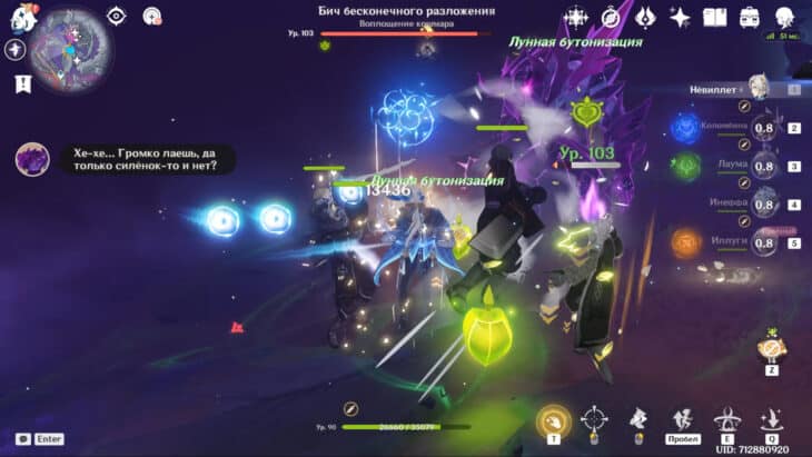 Проводник в демонические небеса на самом деле является ослабленной версией мирового босса «Повелитель скрытых глубин Шёпот кошмаров«. Он не имеет сопротивления ни каким элементам и убивается любым составом. Призывные существа кооперируются и создают щит, который уязвим перед всеми реакциями и в особенности слаб перед Лунными.