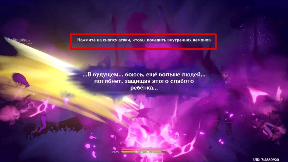В сгустившемся тумане отправляйтесь на поле боя — идите вперёд и жмите кнопку атаки, чтобы победить внутренних демонов. Путь записан на видео: