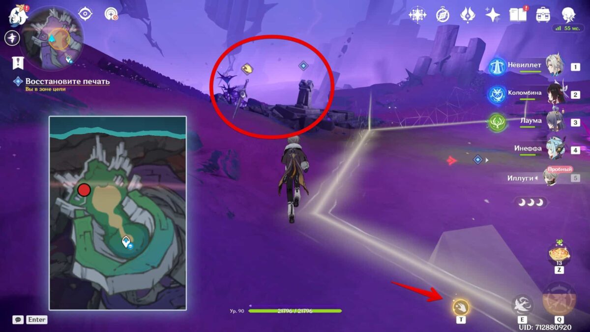 Верните запечатанные мечи в соответствующие ножны, чтобы восстановить древний круг-печать. Первый увидите сразу перед собой: возьмите его («Т») и киньте в ближайший камень (ЛКМ).
