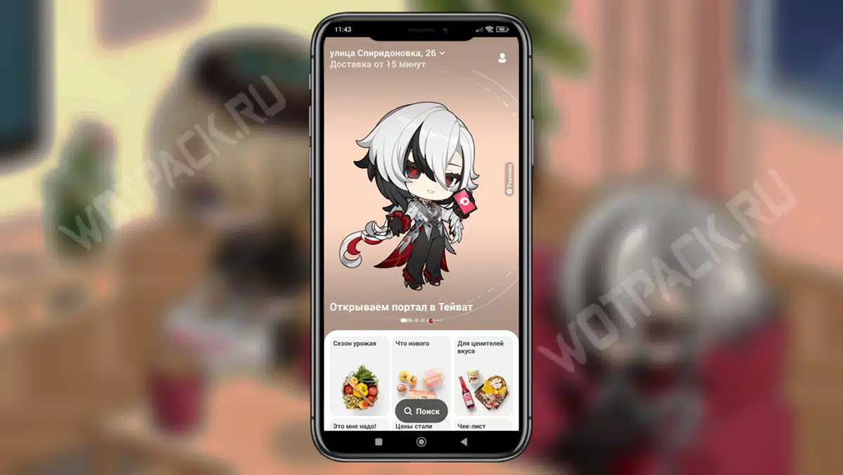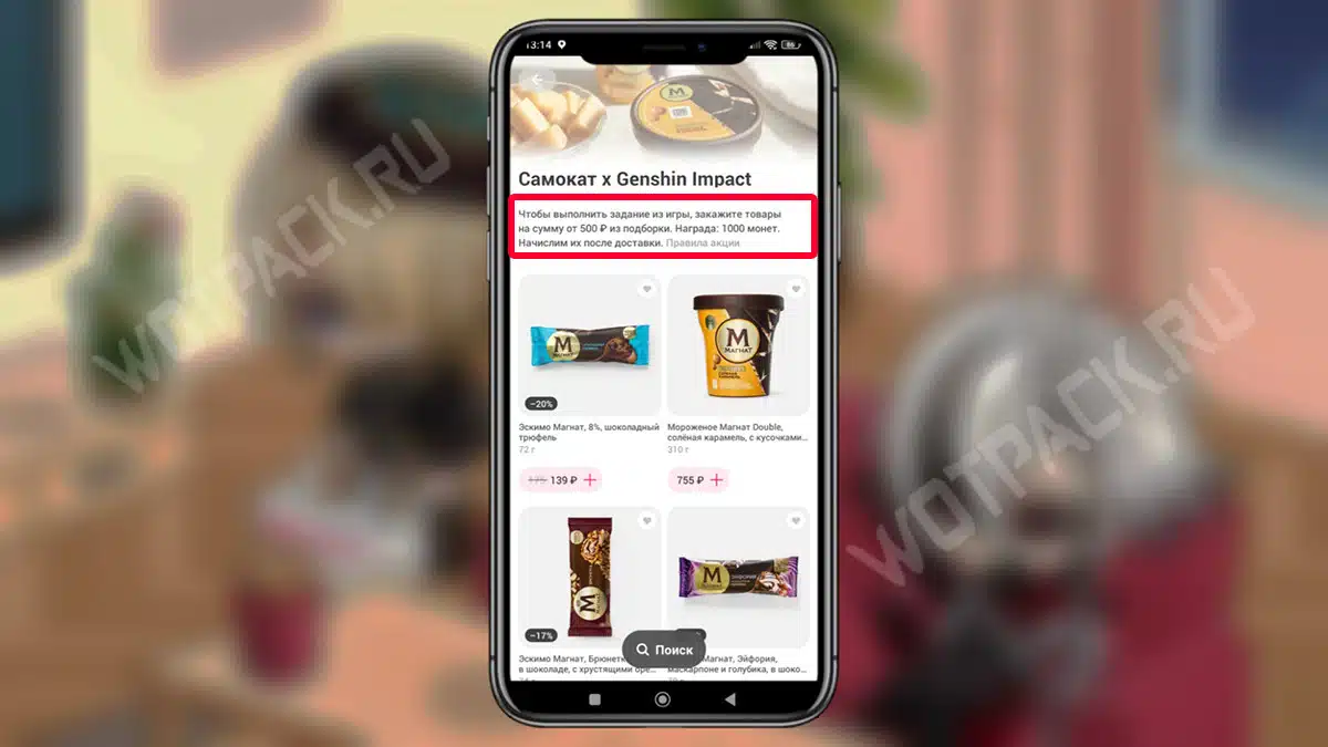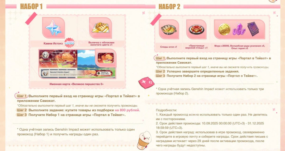 Чтобы получить подарочные купоны, обязательно нужно предварительно зайти на тематическую страницу «Портал в Тейват» в приложении Самоката перед покупкой.