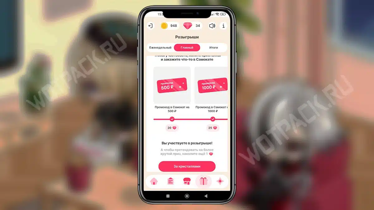 - Чтобы получить шанс побороться за главные призы, копите кристаллы и совершайте заказы в приложении.