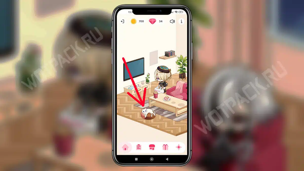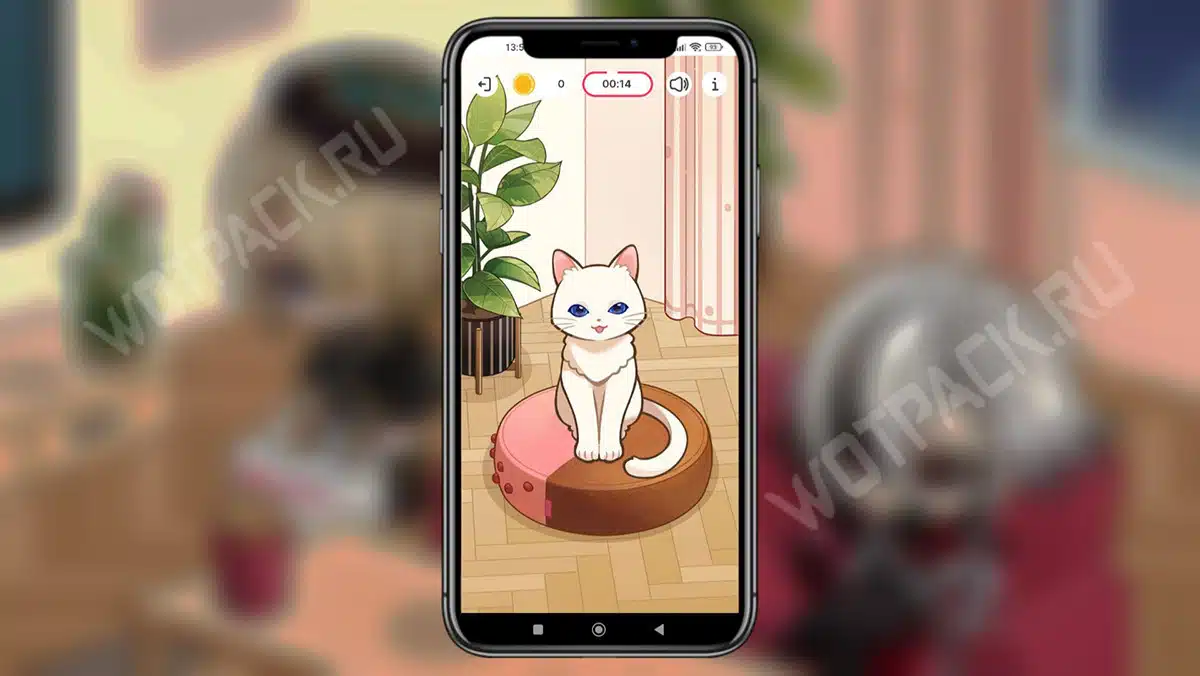 После восьми накопленных кристаллов котик в гостиной проснется и захочет поиграть. Кликните на него для начала испытания: