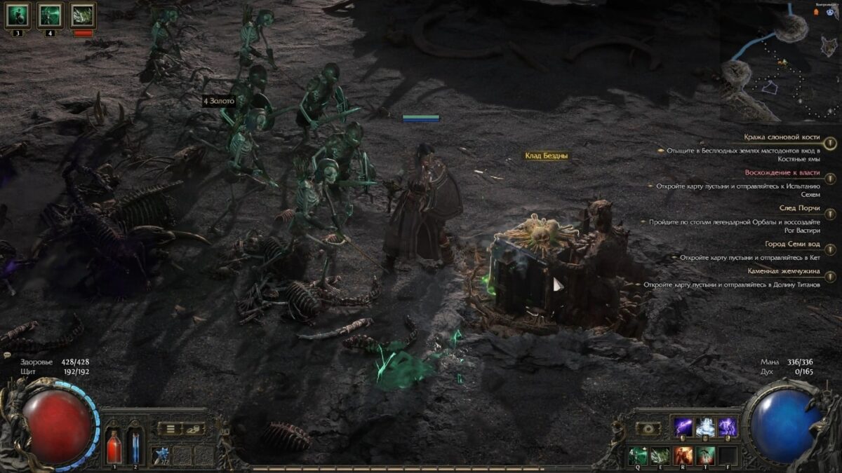 Проходите сюжетную кампанию до момента похода в Бесплотные земли мастодонтов за слоновой костью для Рога Вастири. Попав в локацию и зачистив её, заметите подсвеченные зелёным трещины в земле. Они охраняются множеством врагов, после победы над которыми разлом закроется и на его месте появится награда в виде Клада Бездны.