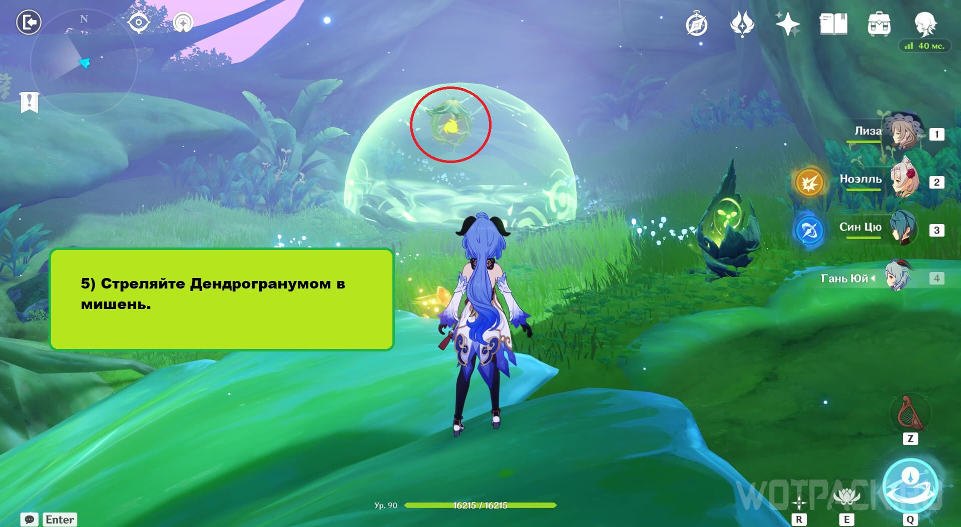 Воспользуйтесь источником Дендрогранумов, и стреляйте в появившуюся Дендро мишень, которая будет раздваиваться. Мишень приведет в первую комнату данжа с желтым камнем №1 и нависнет над ним. Воспользуйтесь Дендрогранумом в последний раз и разблокируйте камень.