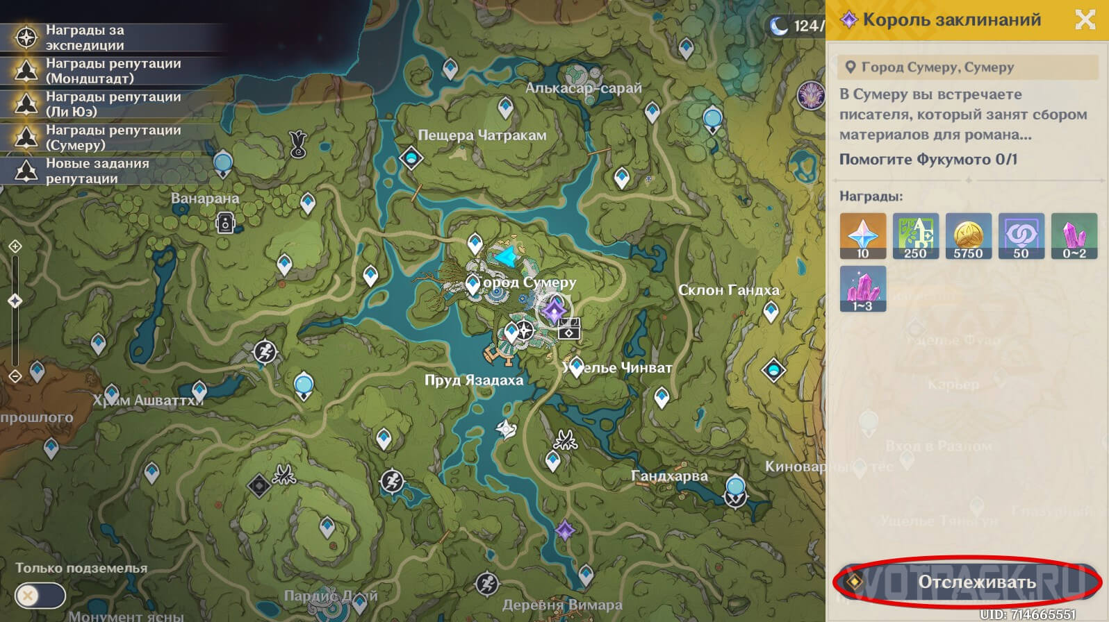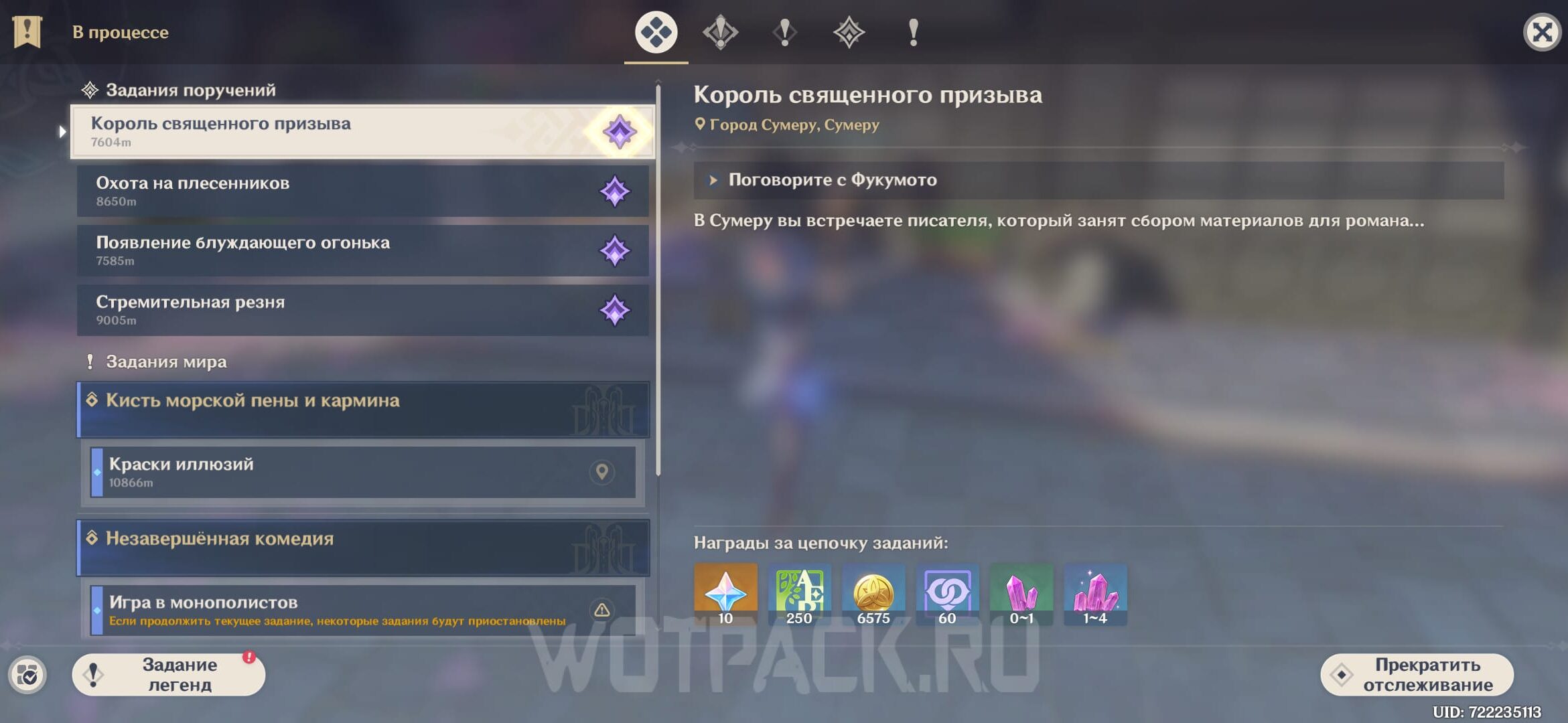 Квест Король священного призыва могут выдать в качестве дейлика после сброса мира. Шанс небольшой, но его можно повысить. Для этого нажмите на «F1», чтобы открыть журнал искателя приключений. Выберите вкладку «Поручения» и в качестве желаемого региона поставьте Сумеру.