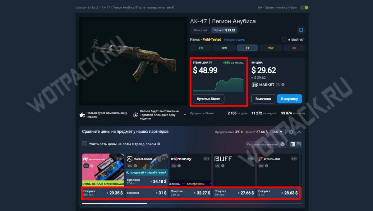 Приобретая тайное с целью крафта, лучше брать оружие на сторонних площадках. С помощью расширения Steam Inventory Helper сможете сравнить цены, зачастую на маркетах пользователи отдают скины на 20-30% дешевле. При особом везении можно урвать пушку и по прайсу в два раза ниже. Учитывайте, что некоторые платформы не принимают оплату в рублях. Желая оплатить через СБП или карты «МИР», можно рассмотреть lis-skins, cs.money, SIH.market, avan и другие подобные сайты.