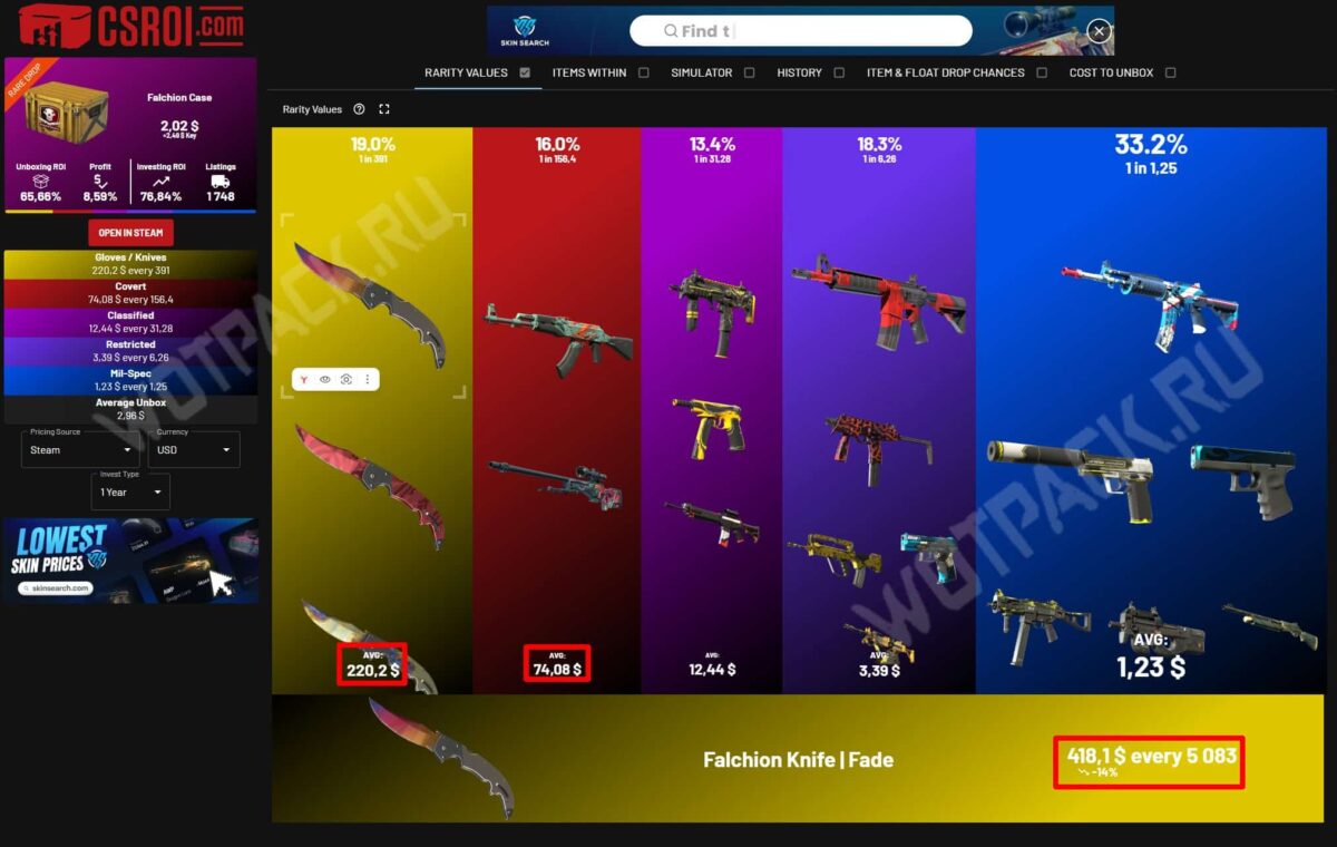Если собираетесь делать контракт с целью дальнейшей продажи ножа, внимательно изучите цены на все ножи, которые могут упасть из крафта. Для этого можно использовать платформу CSROI. Открыв ту или иную коллекцию, сможете посмотреть средние цены на красное и золотое оружие, а также ознакомиться с возможным профитом с различного дропа. Чем меньше разброс между представителями одной коллекции, тем лучше.