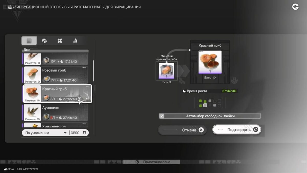 - Переместитесь на «Дицзян» и с помощью панели управления в комнате для выращивания извлеките мицелий.