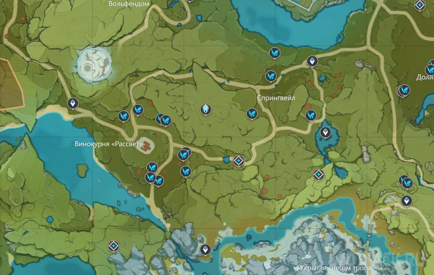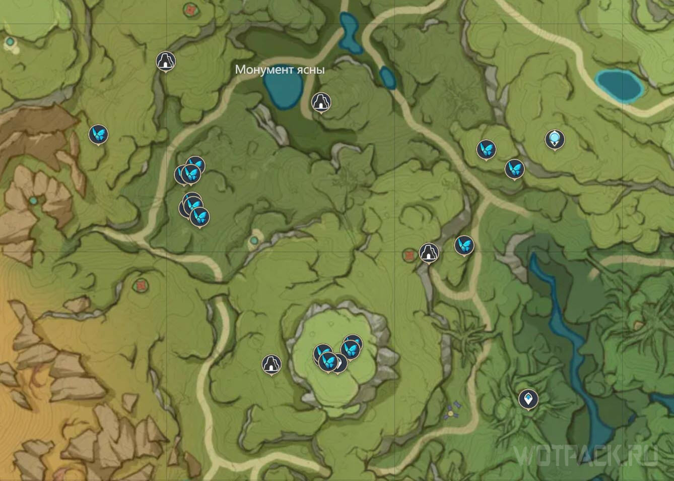 Рекордно низкое количество бабочек обитает в Сумеру. Всего 17 единиц ресурса получится собрать в Дендро королевстве, 16 из которых сосредоточены в локации Монумент ясны.