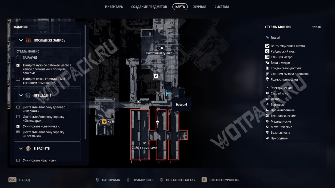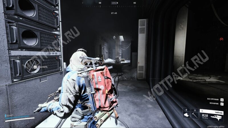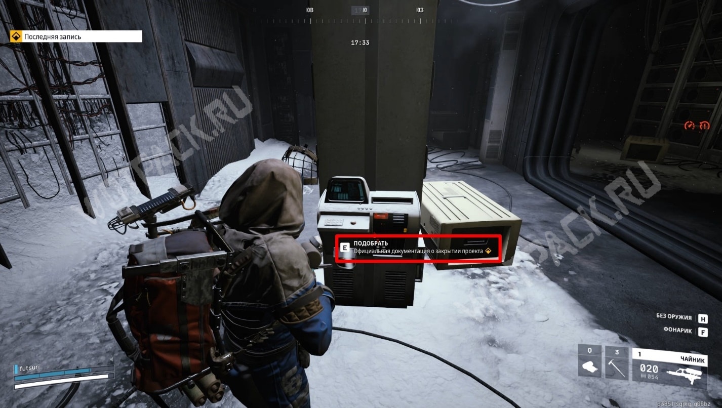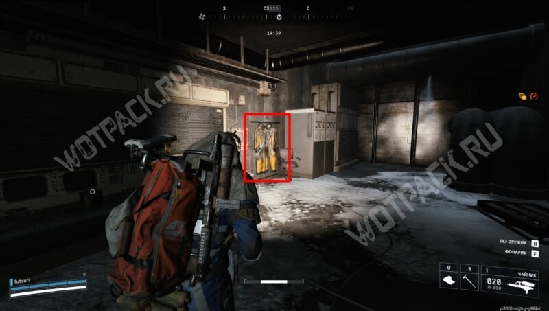 На стыке между коридором и Восточным тоннелем находится подсобка — на карте она расположена севернее правых секций хранилища. Осмотрите внутри левую стену, там висят два жёлтых защитных костюма, в одном из них лежит ключ. Подберите предмет и возвращайтесь к сейфу.