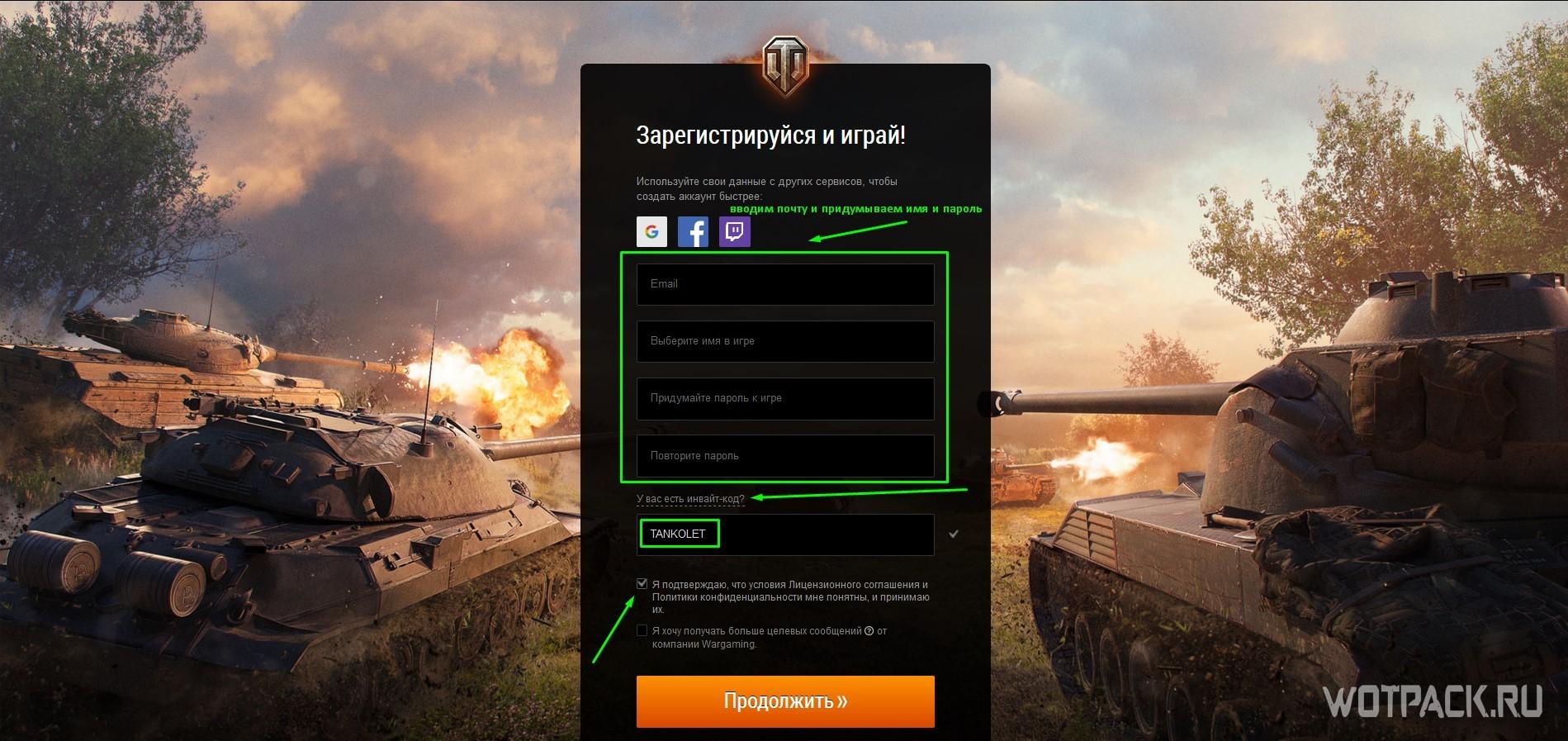 - Регистрируем новый аккаунт по специальной инвайт-ссылке и обязательно во вплывающей строке указываем инвайт-код TANKOLET (дает 4 прем танка в аренду) или ILOVETANKS (дает больше серебра и золота) . Это необходимо для эффективного старта, чтобы получить 7 дней премиум аккаунта, сумму игрового золота и легкий прем танк Т-127 в подарок.