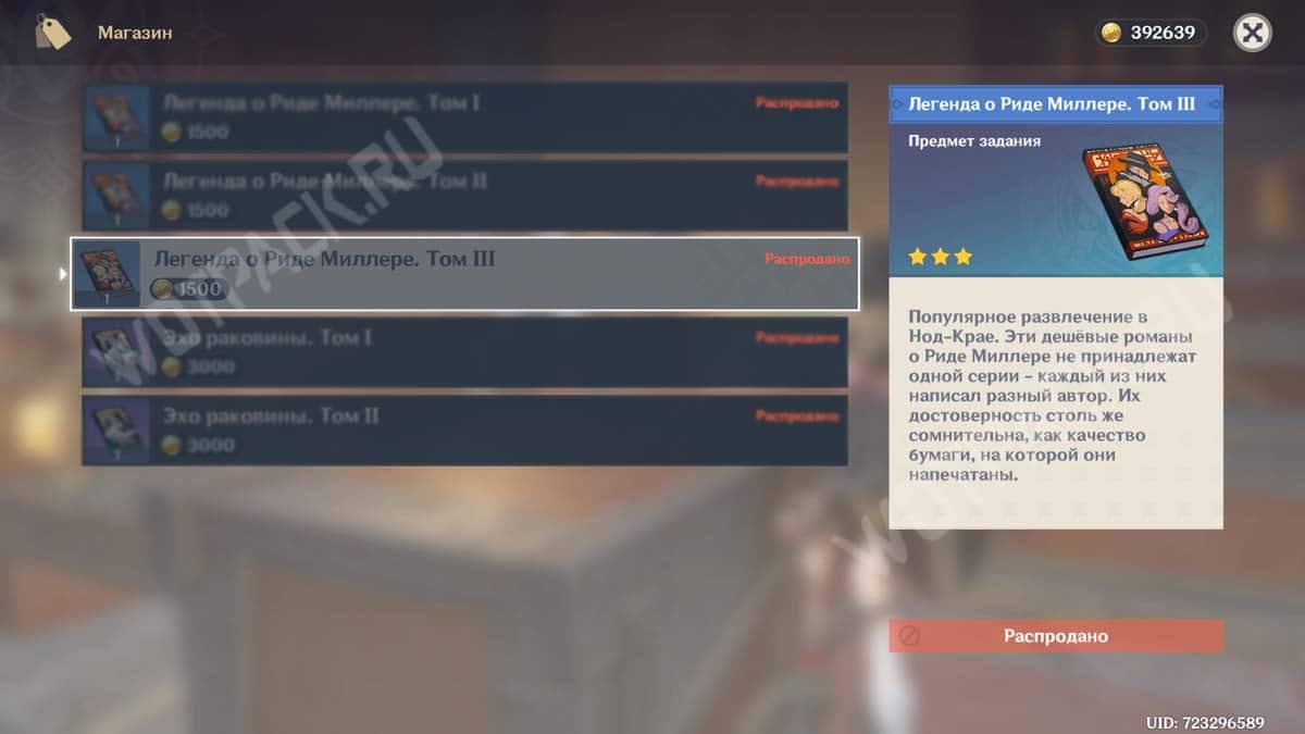 Трилогия завершается произведением всё той же 3⭐ редкости за 1 500 моры. Помимо этой серии, торговец предлагает книги «Эхо раковины».