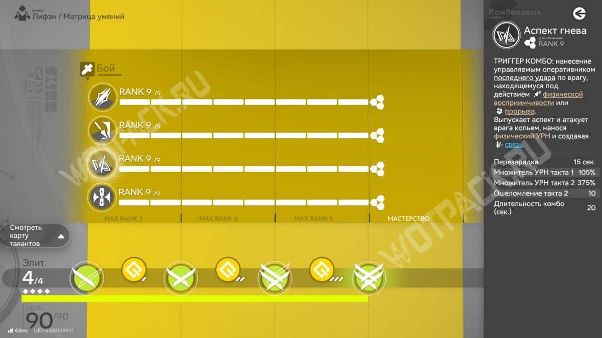 - Комбо «Аспект гнева» — срабатывает при последнем ударе по врагу под восприимчивостью или прорывом. Дамажит и создает связь.
