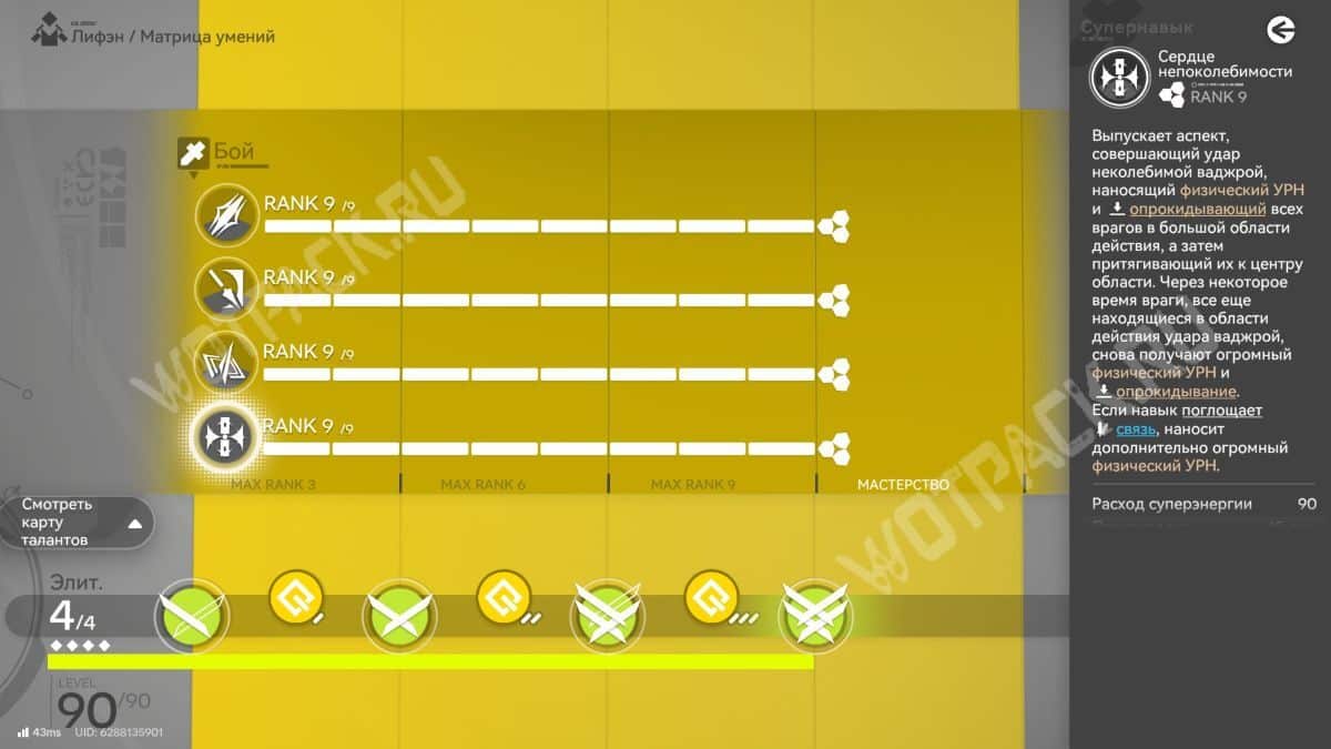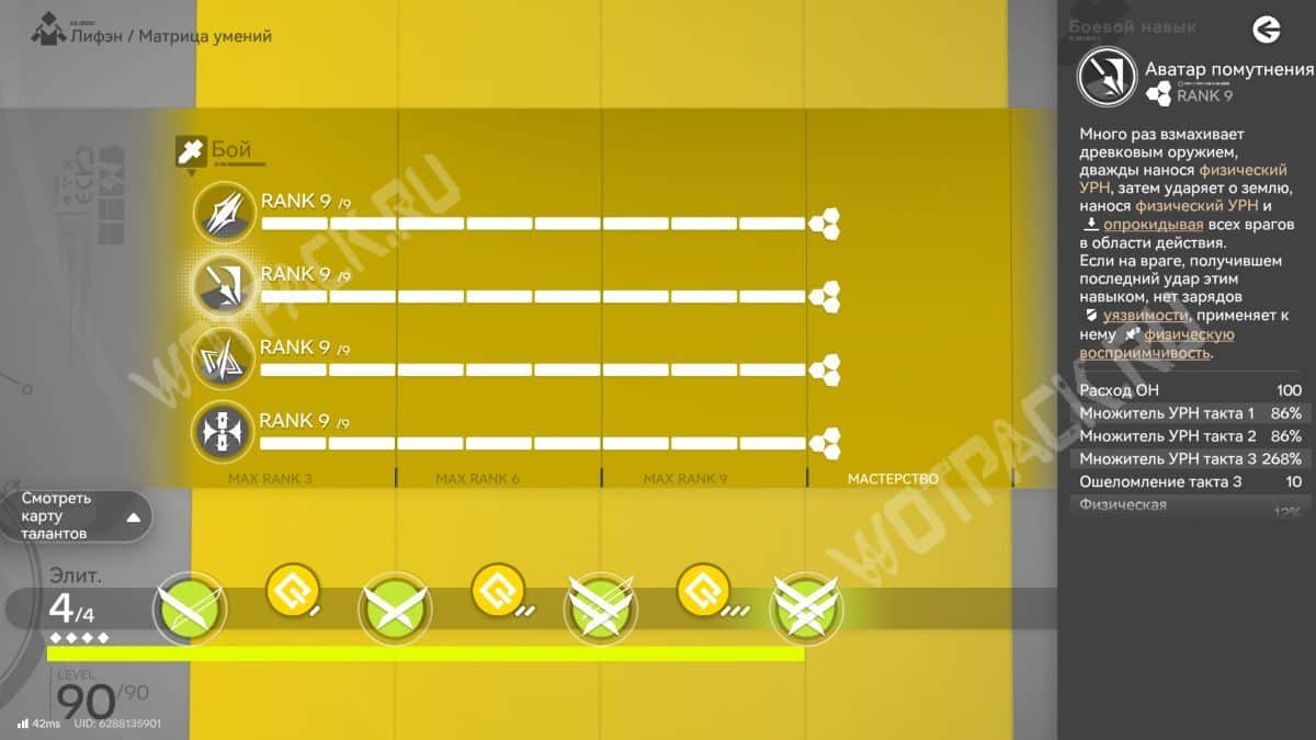 Основная задача Лифэна в каждом отряде — постоянное наложение уязвимости и опрокидывания противника, а также пассивное нанесение дамага. Также важно активировать его комбо, дающее связь. Порядок прокачки способностей: