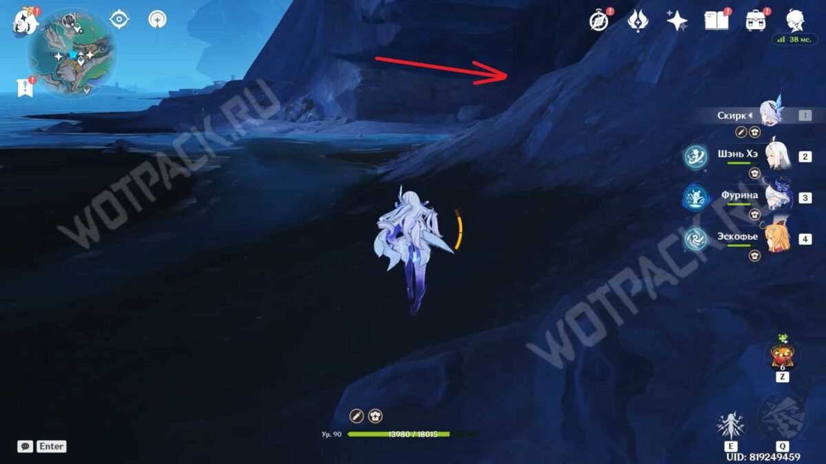 Воспользовавшись точкой перемещения, повернитесь лицом к берегу и бегите к нему. Придерживайтесь линии скал, пока не заметите небольшой свет, исходящий из пещеры.