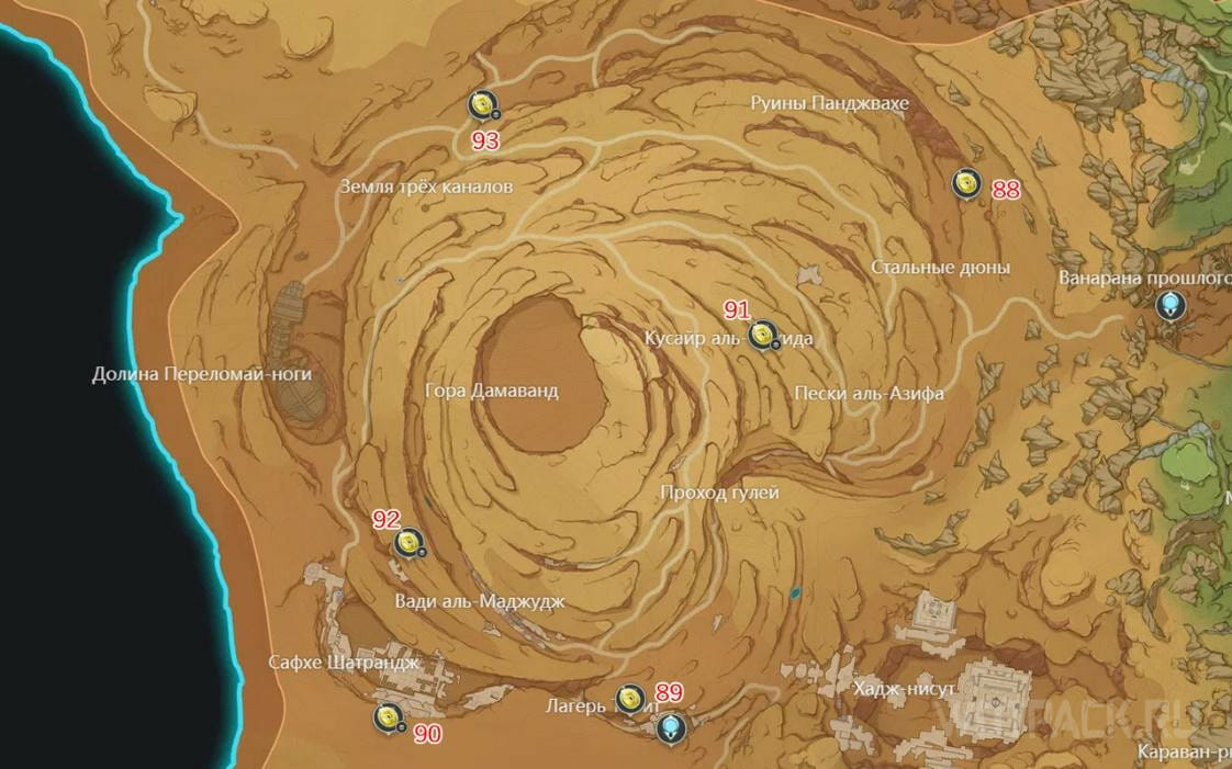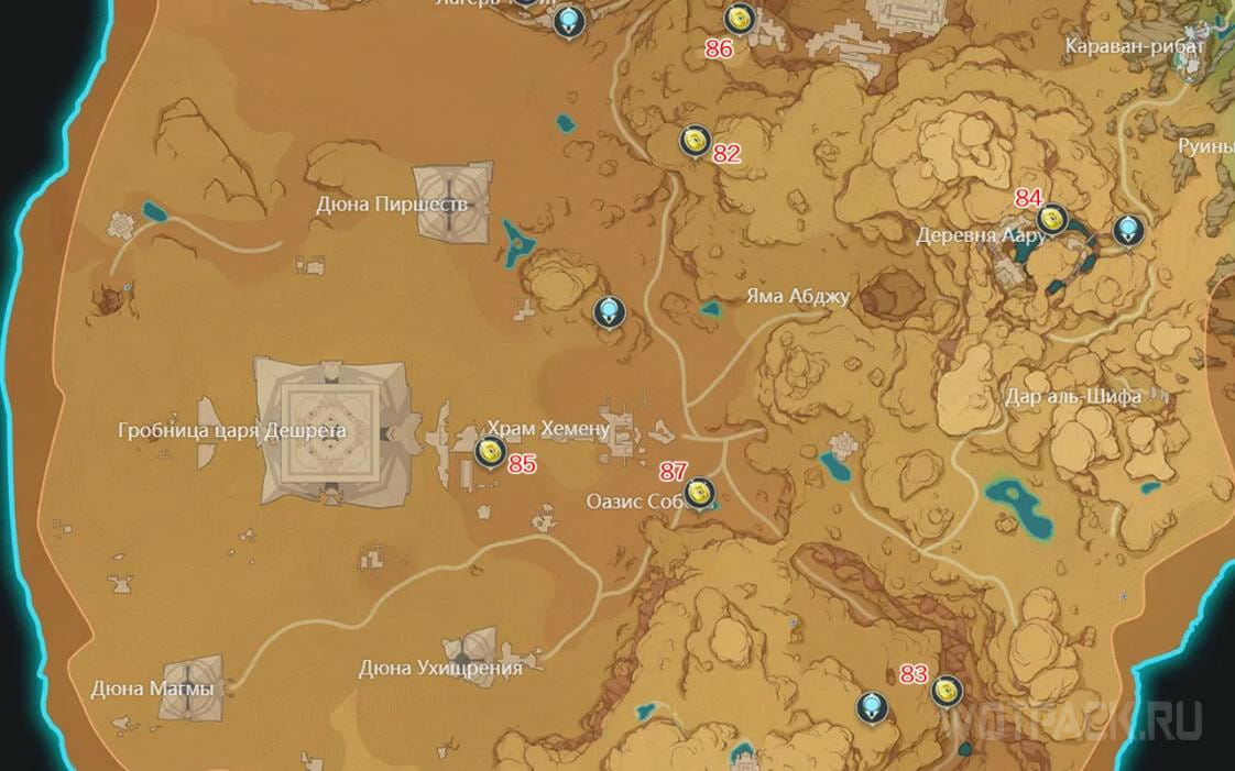 Следующий артефакт находится к юго-востоку от Гробницы царя Дешрета. Воспользуйтесь ближайшей к локации Статуей Архонта, если не открыли телепорт на входе в пирамиду, и бегите в сторону руин. Рядом с монументом есть ветряной поток и воздушные кольца — воспользуйтесь ими для быстрого перемещения по песчаным барханам. Кристалл можно обнаружить на разрушенной колонне, около которой роются похитители сокровищ.