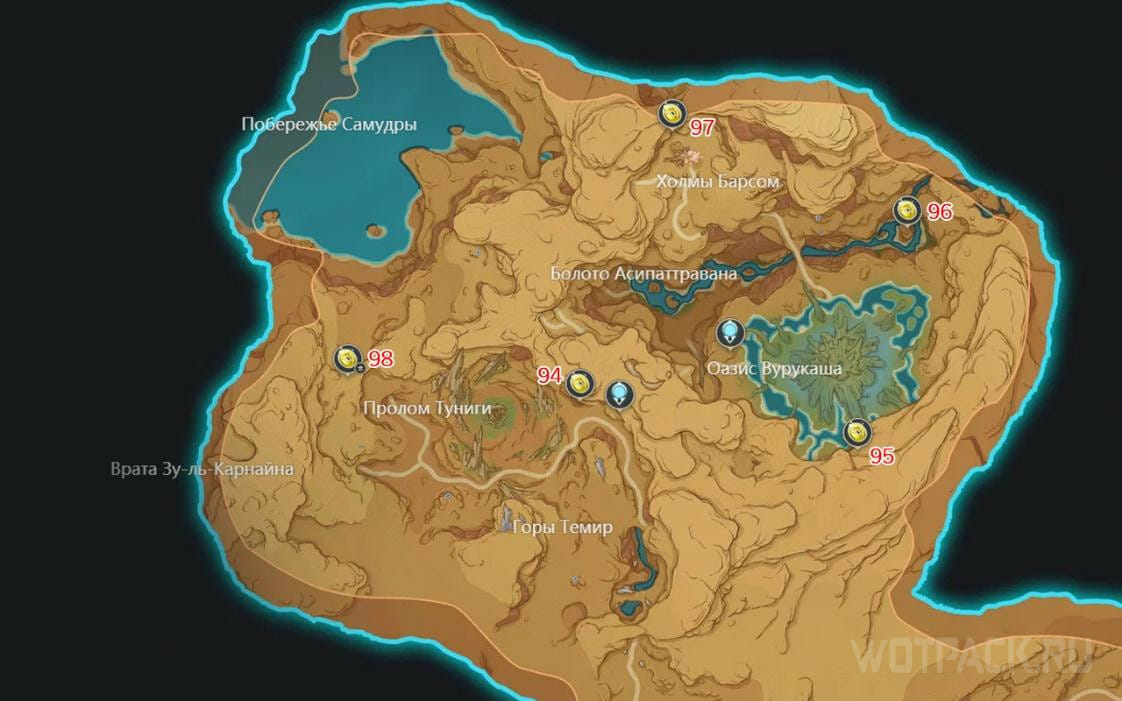 Расположен на территории города Сумеру: переместитесь к точке телепортации в северо-восточной части, что рядом с «винтовой» лестницей. Спуститесь по ступенькам, выходящим от телепорта, до середины, а после спланируйте к башенке, находящейся слева.