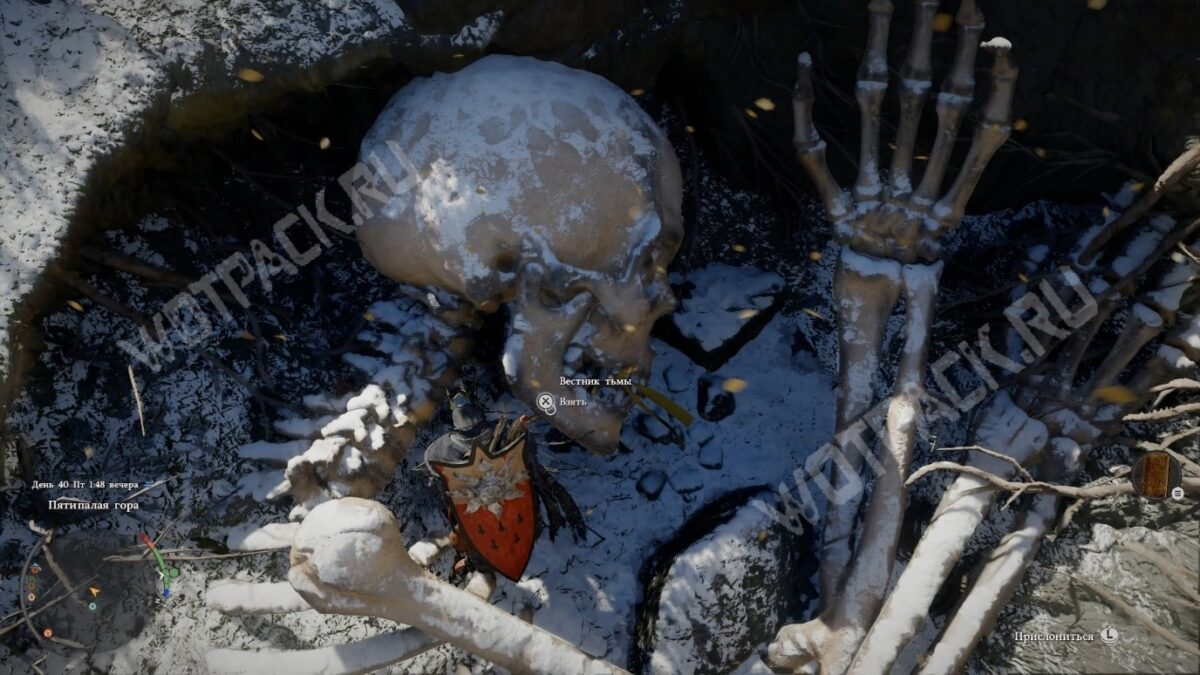 Вестник тьмы — один из сильнейших двуручников игры, который легко раздобыть в любой момент. Клинок находится между челюстями скелета великана в святилище белой пустоши на Пятипалой горе, у северо-западной границы Пайлуна.