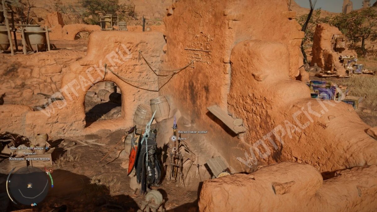 Висмутовое копьё обладает бонусной атакой стихией висмута. Можно забрать с оружейной стойки в разрушенном доме у колодца просветления, который находится в пустыне к северо-востоку от Шпиля мороза.