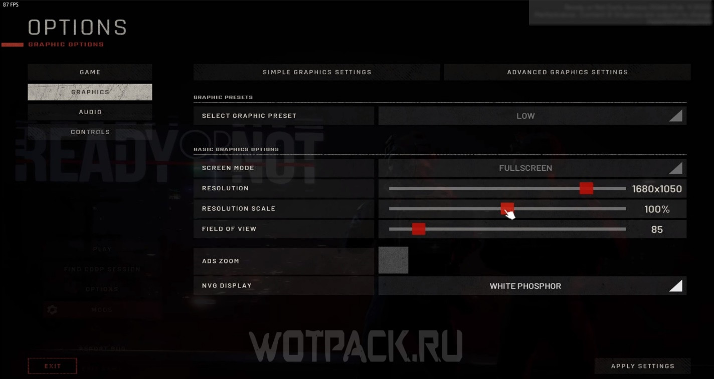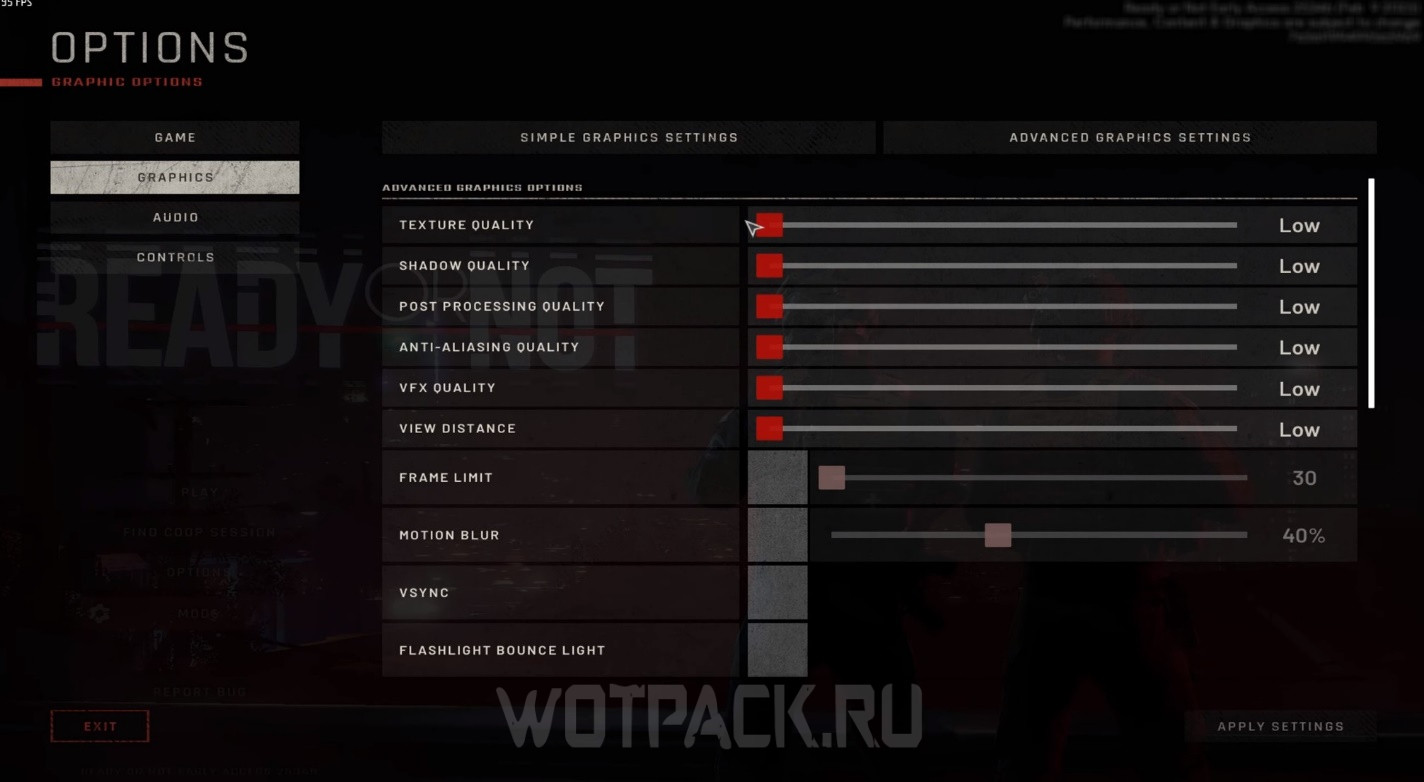 Настройка Ready or Not для слабого ПК производится не только в игре, но и за ее пределами. Об общих способах повысить FPS можете прочитать в отдельном гайде. Разбираясь с параметрами в игре, стоит выставить следующие настройки: